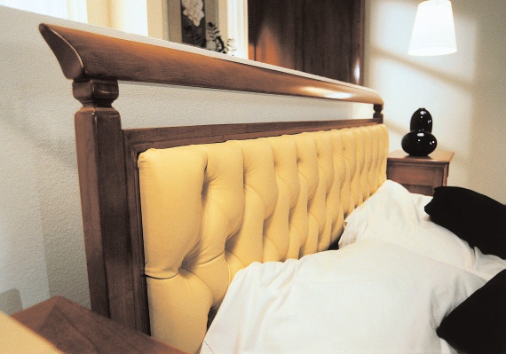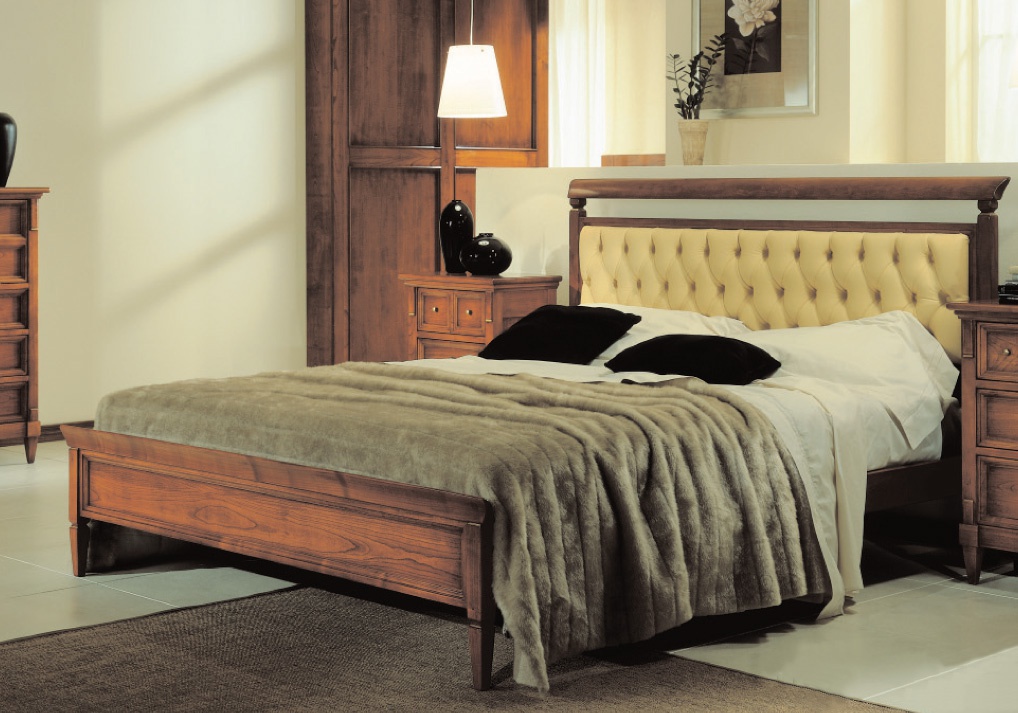 Double bed with upholstered headboard from the Italian manufacturer Avenanti. Model with case handmade from wood with a coating of veneer. Frame trim as pictured. Upholstery headboard leather with polyurethane foam filler.