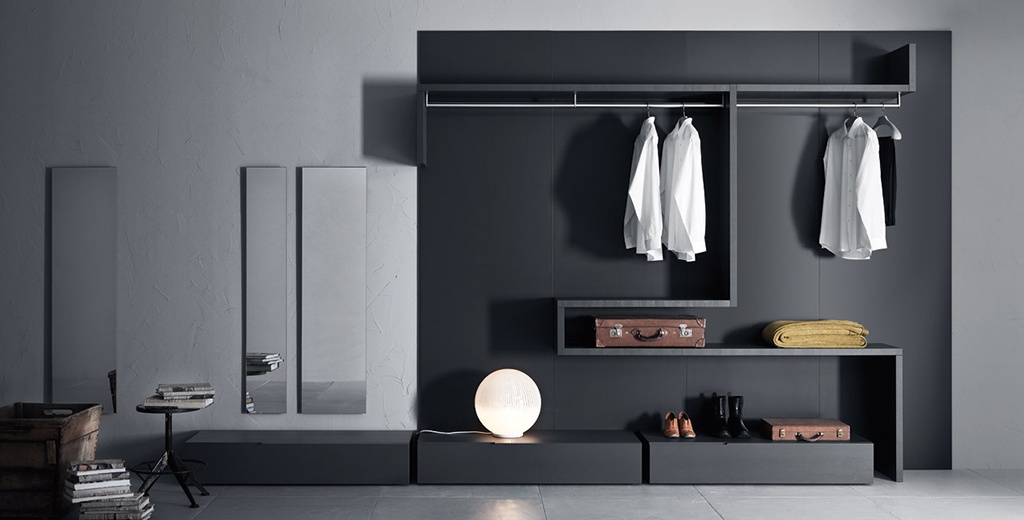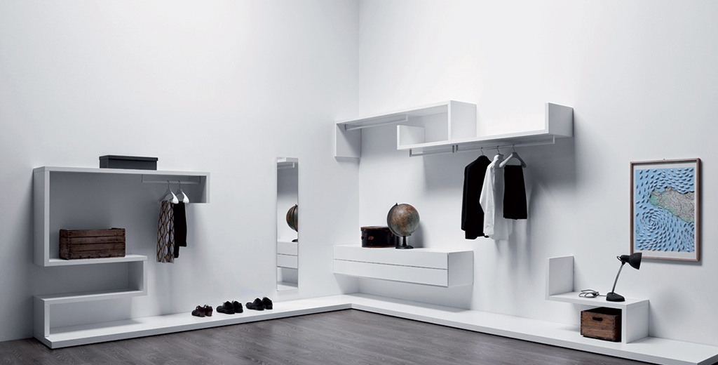 Dressing Libera&Snake from the Italian manufacturer Pianca. A new way of understanding a dressing room, a creative solution, the system is distributed along the wall of shelves on iron brackets, creating a playful but always functional shapes. Finishes in stock: white, grey, walnut, dark oak, also presented a variety of surfaces: lacquer or matte. Modern style.