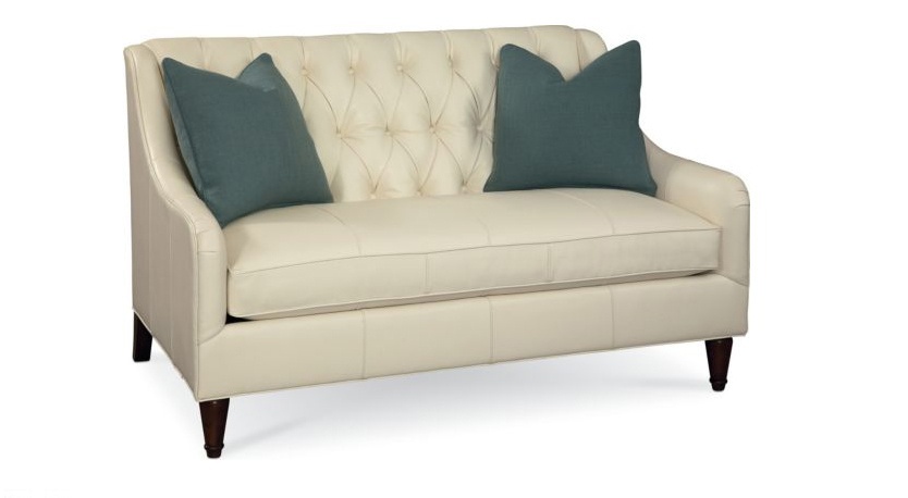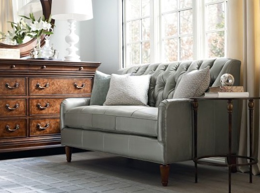 Two-seater sofa from the Barcelona collection Upholstery/Leather from an American manufacturer Thomasville. Soft leather sofa of classic proportions, designed in the English style, designed to comfortably accommodate two. The frame and legs are carved from wood, decorated in brown colours. Small padded armrests, a removable seat cushion with extra volume, the back is decorated with stitch Capito. Upholstery leather of brown color. Options upholstery and trim can be selected in the catalog of the manufacturer.