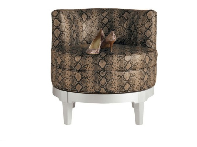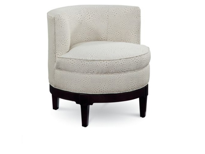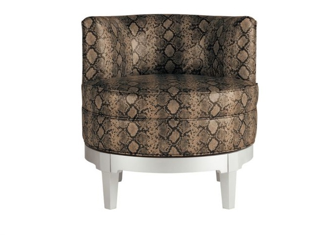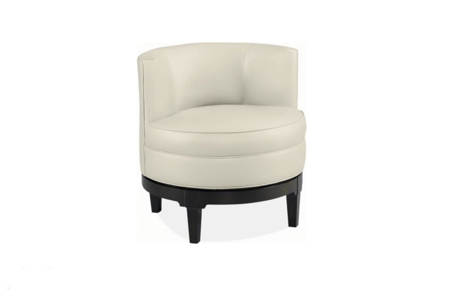 The Anja chair collection Upholstery/Leather from an American manufacturer Thomasville. Round low chair without armrests, designed in the style of postmodernism, decorate living room, bedroom or boudoir. Frame, base and legs carved from wood in black color. Low round backrest, seat with extra volume; upholstery textile in a milky-white colour scheme. Options upholstery and trim can be selected in the catalog of the manufacturer.