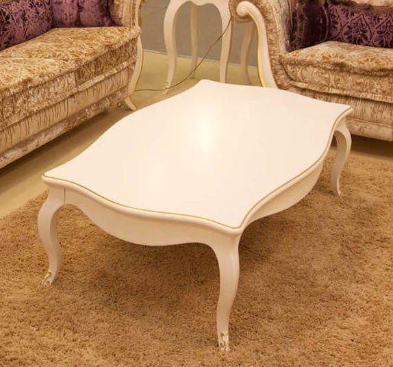Coffee table from the Italian manufacturer Bbelle. Curly legs and a rectangular top made of wood. The surface is treated C103 Bianco lacquer and gold leaf. The model is decorated with hand-carved.