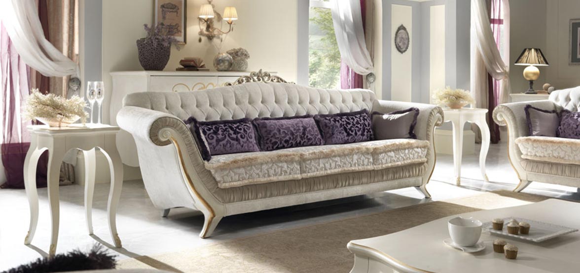 Three seater sofa from Italian manufacturer Bbelle. The model is made in classic style. The frame is made of wood. Finishing is performed C103 Bianco lacquer, carved details - gold foil. Upholstery textile Daisy PQ751 col.05 / seat Daisy PQ 749 col. 05. Complement the design of decorative pillows.