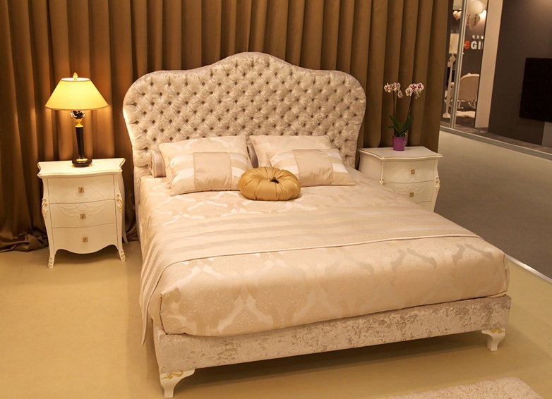 Double bed Diamond from the Italian manufacturer Bbelle. The model grid for the mattress. The frame and legs of wood. Upholstery - fabric Daisy PQ 751 col. 01. Legs finish C103 Bianco and gold foil. Upholstered headboard decorated with stitch-Capito.