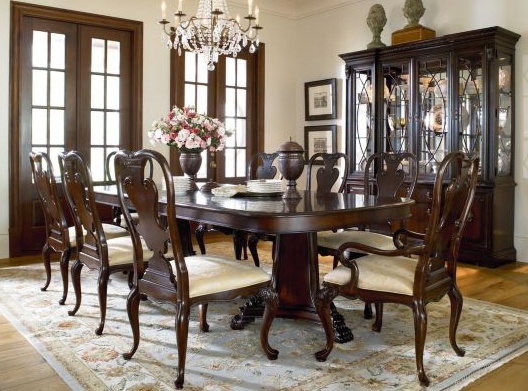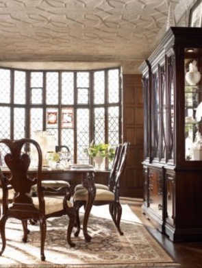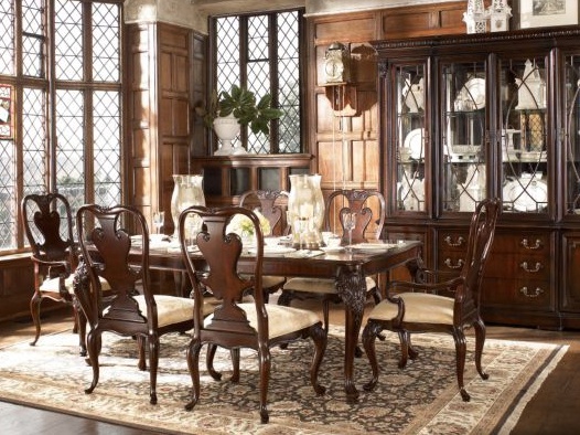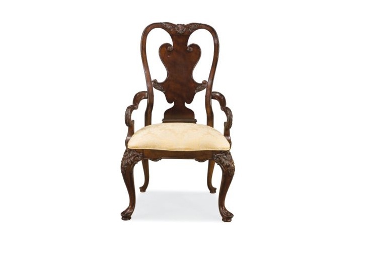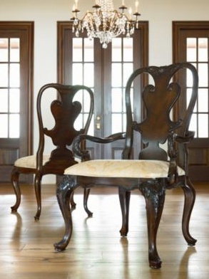 The dining chair from the Brompton Hall collection from the American manufacturer Thomasville. Carver chair with upholstered seat designed in the Rococo style, will decorate the living room or dining room, furnished in a traditional style. Chair in mahogany with brown tones, aged wood; you can choose the version with armrests or without them. Cabriole carved legs bent to the sides, the arms of complex shape. Oval back carved in the form of a violin and is decorated with sophisticated ornament. Finish options and upholstery seats can be selected in the catalog of the manufacturer.