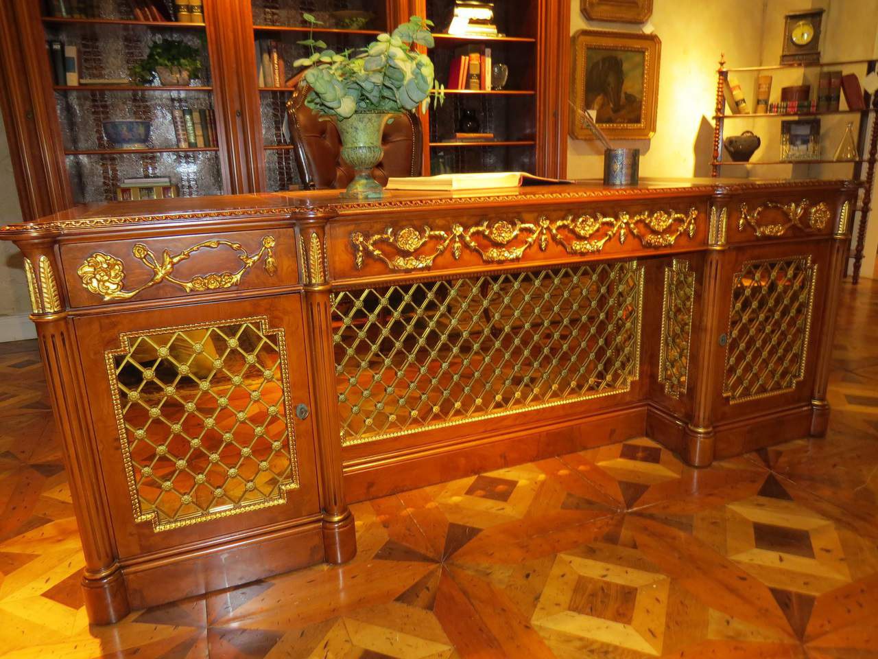 Desk from the Italian manufacturer Francesco Molon. The model is made of wood. Finish: natural leather, gold foil, mirror (Finish: Burl 03 w/ Aged Gold/No Distressing, Semi-Shiny/Leather PFC013).
