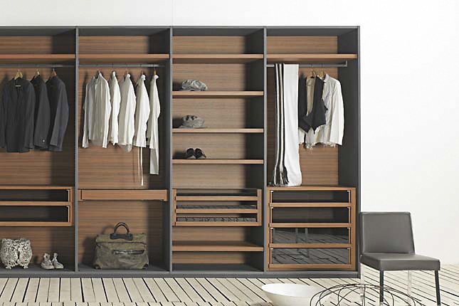 Interni armadi wardrobe from the Italian manufacturer features tisettanta furnishings. The frame is made from solid wood, aluminium and veneer wood. Furniture and doors made of smoked glass. The color of this model of wardrobe you can choose from the catalogue of the manufacturer.