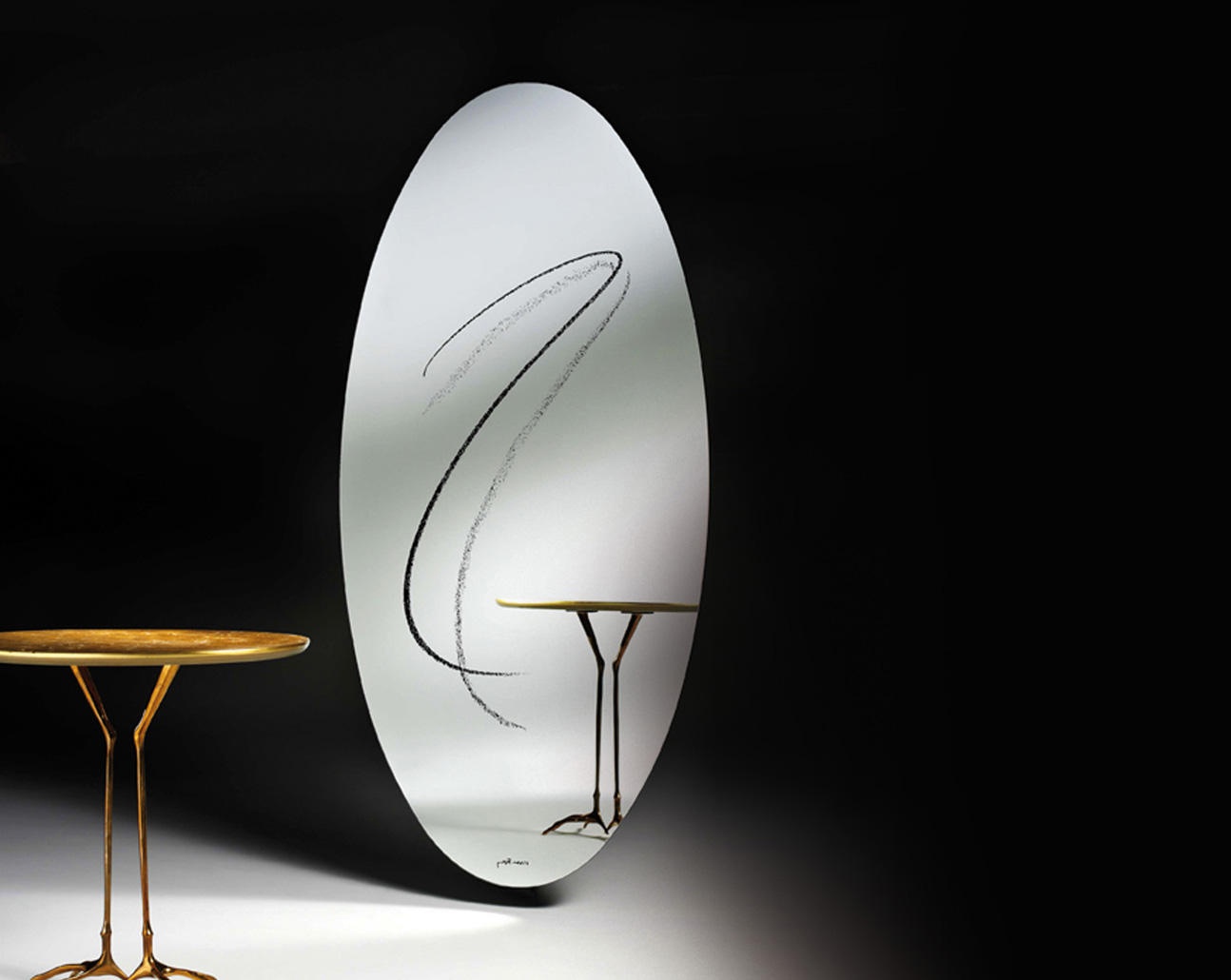 The mirror Le Miroir 'S' from Italian manufacturer Cassina. A design model is oval shaped with the inscription on the mirror, made by silk.