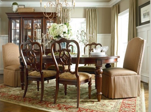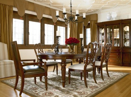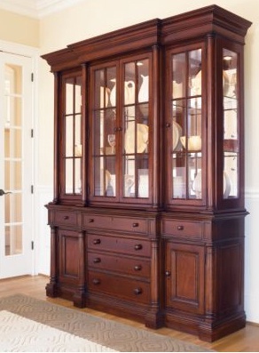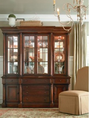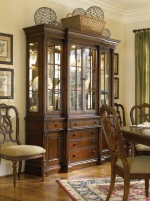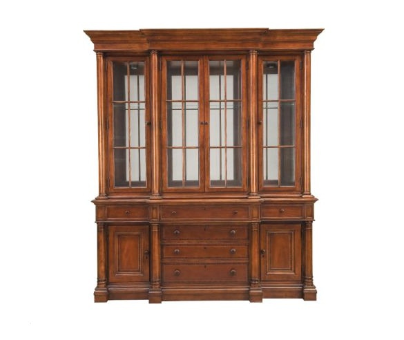 Breakfront sideboard from the collection of Fredericksburg from the American manufacturer Thomasville. High sideboard classic silhouette with mirrored showcase looks great in both traditional and modern interior of the dining room or living room. Made of wood in light brown color, the wood texture is well developed.