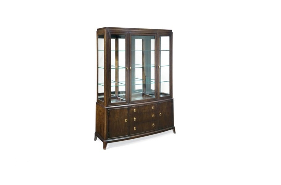 The sideboard from the Studio 455 collection from the American manufacturer Thomasville. Elegant sideboard modern silhouette, tranquil, sleek, deep brown wood tones, elegant finish. Showcase with three bevelled glazed doors and nine adjustable glass shelves. There are halogen lights with touch dimmer, which is controlled by an intermediate hinge on the right. The lower part has 3 drawers, the top one with a tray for silverware and two compartments with swinging doors. Finish options of wood you can choose from the catalogue of the manufacturer.