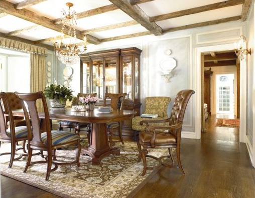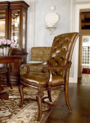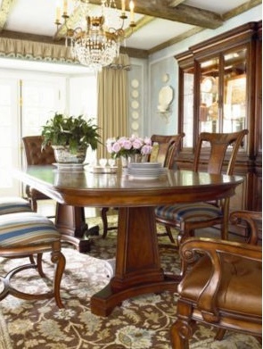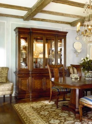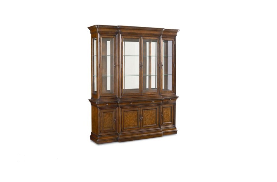 The sideboard from the collection of the Deschanel from the American manufacturer Thomasville. High sideboard classic silhouette with mirrored showcase looks great in both traditional and modern interior of the dining room or living room. Made of wood in a Golden brown colour, the surface of panels are processed under hardware antique gold. Serving the Central part gives the traditional silhouette of solidity. Cabinet with four hinged doors and adjustable shelves fully glazed, background - mirror; includes halogen lights with touch dimmer, which is controlled from the middle right hinge. The lower part has three drawers, a middle with a tray of silverware; the bottom three compartments with hinged doors and removable shelves. The top is decorated with carved entablature.