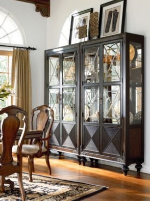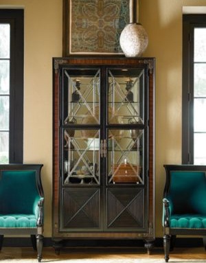 The Masai sideboard Curio from the collection of Ernest Hemingway from the American manufacturer Thomasville. The Masai tribe was a source of inspiration in Hemingway's African experiences. Small mirrored cupboard, decorated in a colonial style, may also be used for storage of collections. Material - wood in brown colour; the panels of the doors and under the legs finished in ebony. Carved metal legs shod in clogs, corners of doors decorated with forged metal. The front of the cupboard completely closed frame with two glazed doors with metal decoration in the form of rhombs. One stationary shelf and three adjustable glass form the window. There are halogen lights with touch dimmer, which is controlled by the hinge on the right. The bottom part has adjustable wooden shelf and drawer with tray for silverware.