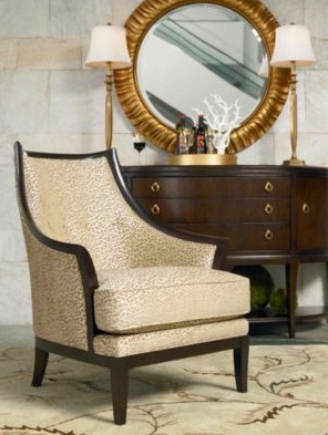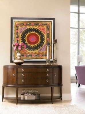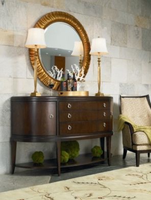 Sideboard credenza from the Studio 455 collection from the American manufacturer Tomasville. Universal buffet dresser perfect for storing glassware and silver in the dining room, or jewelry and lingerie in the bedroom. Material - wood elegant brown tones, metal accessories. Made in a modern style; a sleek semi-circular front saves space; lower shelf can serve as a basis for display. Three drawers in the middle, rounded doors with removable shelves. Semicircular tops of black granite. Finish options can be selected in the catalog of the manufacturer.