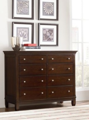 Chest from the collection Bridges 2.0 Thomasville American manufacturer. Universal model in classic style, suitable for a city apartment or a country cottage. The dresser is made of wood in dark cherry warm colours, accessories - brushed Nickel. The refined wood finish Mocha. Table top with carved edge, six drawers to store linens and warm clothes, two top drawer for jewelry and accessories. The choice of finishes and accessories in stock.