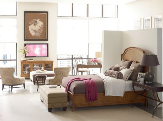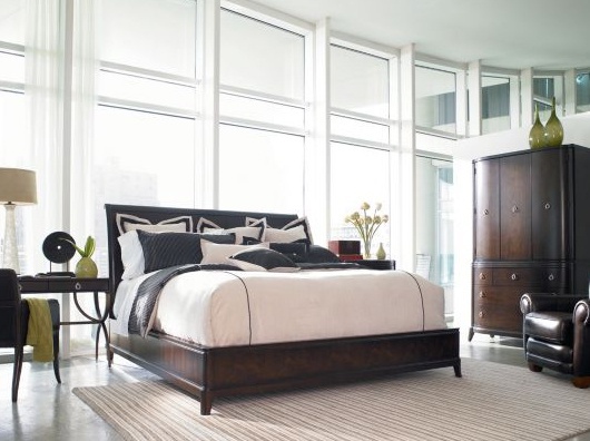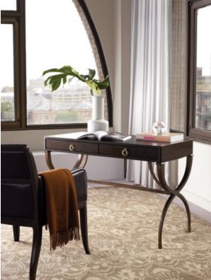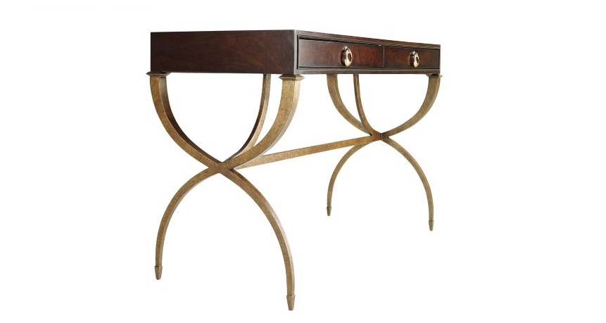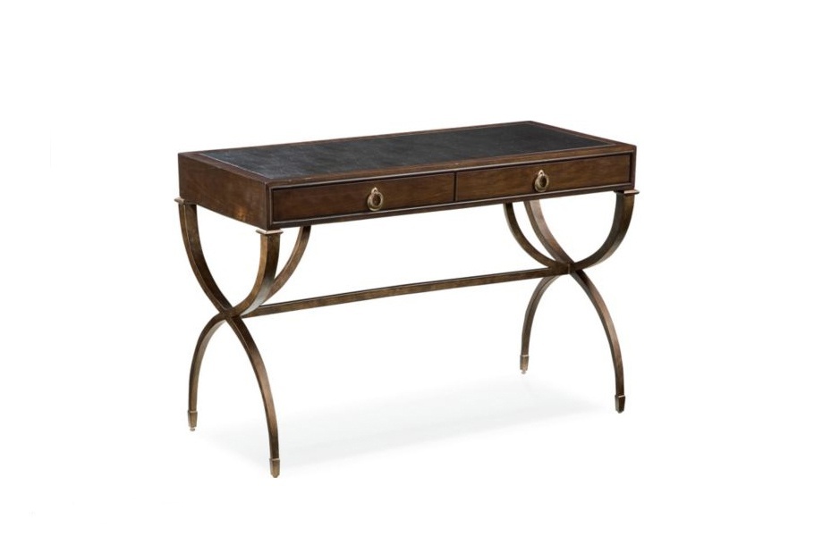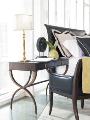 Bedside table from collection Studio 455 from an American manufacturer Thomasville. Bedside table designed in the style of Neoclassicism in the form of a small mobile table with two drawers. It can be used both in the bedroom and in the living room as pridivannogo or placed freely in space. Softened rectilinear shape, deep brown hues of the wood. Graceful legs to the rungs, furniture and decoration made of metal; top with black leather insert. The choice of finishes and accessories in stock.