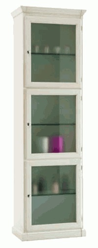 Showcase from Italian manufacturer Selva with a right or left swinging doors. Internal filling: three height-adjustable glass shelves. The side pieces of the cornice and base can be removed. The frame is made from solid American Tulip tree, Sonam veneered Tanganyika. The model can be extended with built-in lighting. In the manufacture of shutters use frosted / clear glass. Finish color – cognac / cherry / walnut / hand polished and waxed French cherry / dark walnut "antique" (may be polishing and waxing handmade) / white patina / beige "antique". Optional: without lighting(I1), with lighting(I2). The glass doors can either be frosted (V1) or transparent.