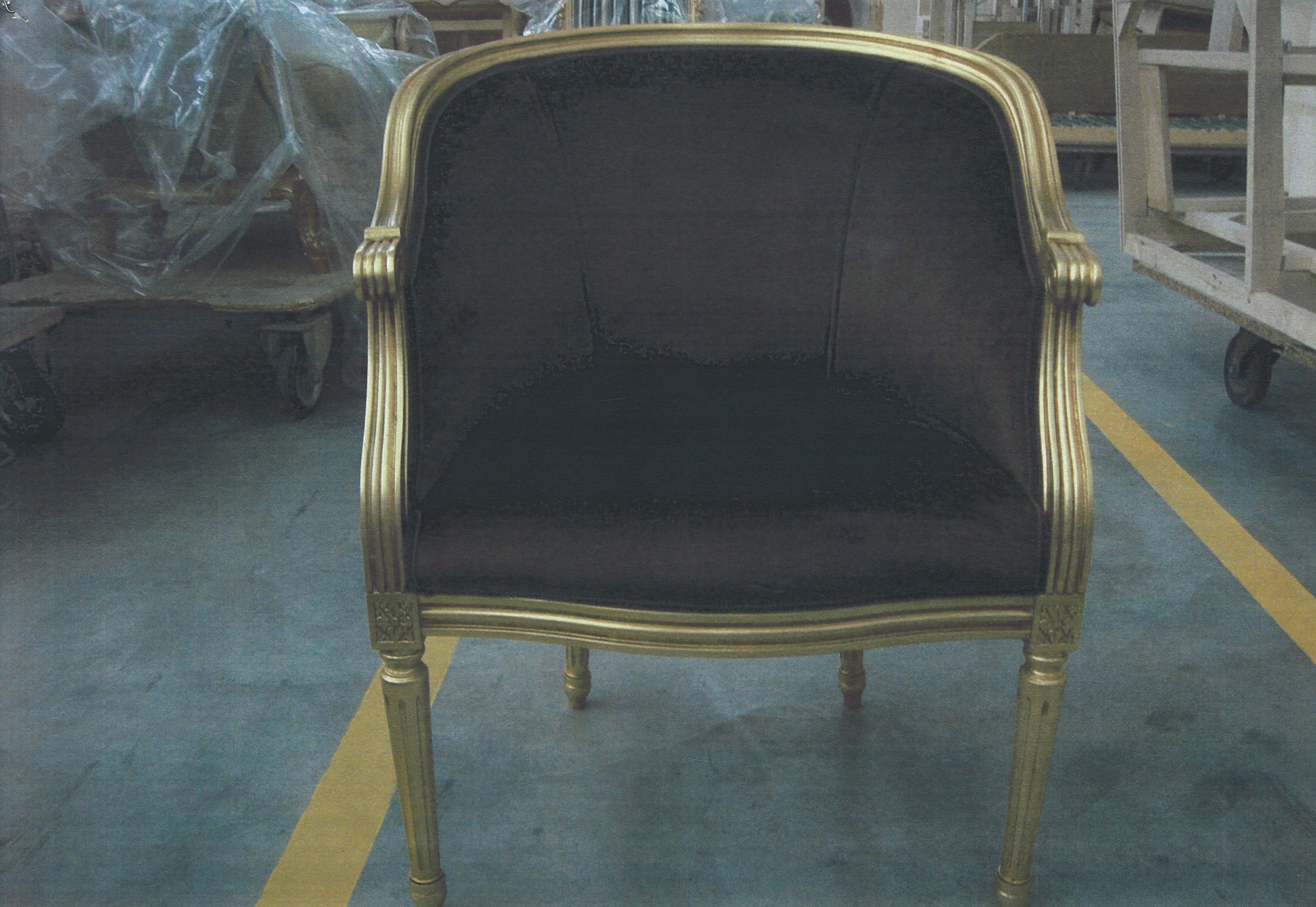 | Description: | A chair with a semicircular back. The frame is made from solid, carved, handmade, gold foil code 10. Upholstery textile 558/E |