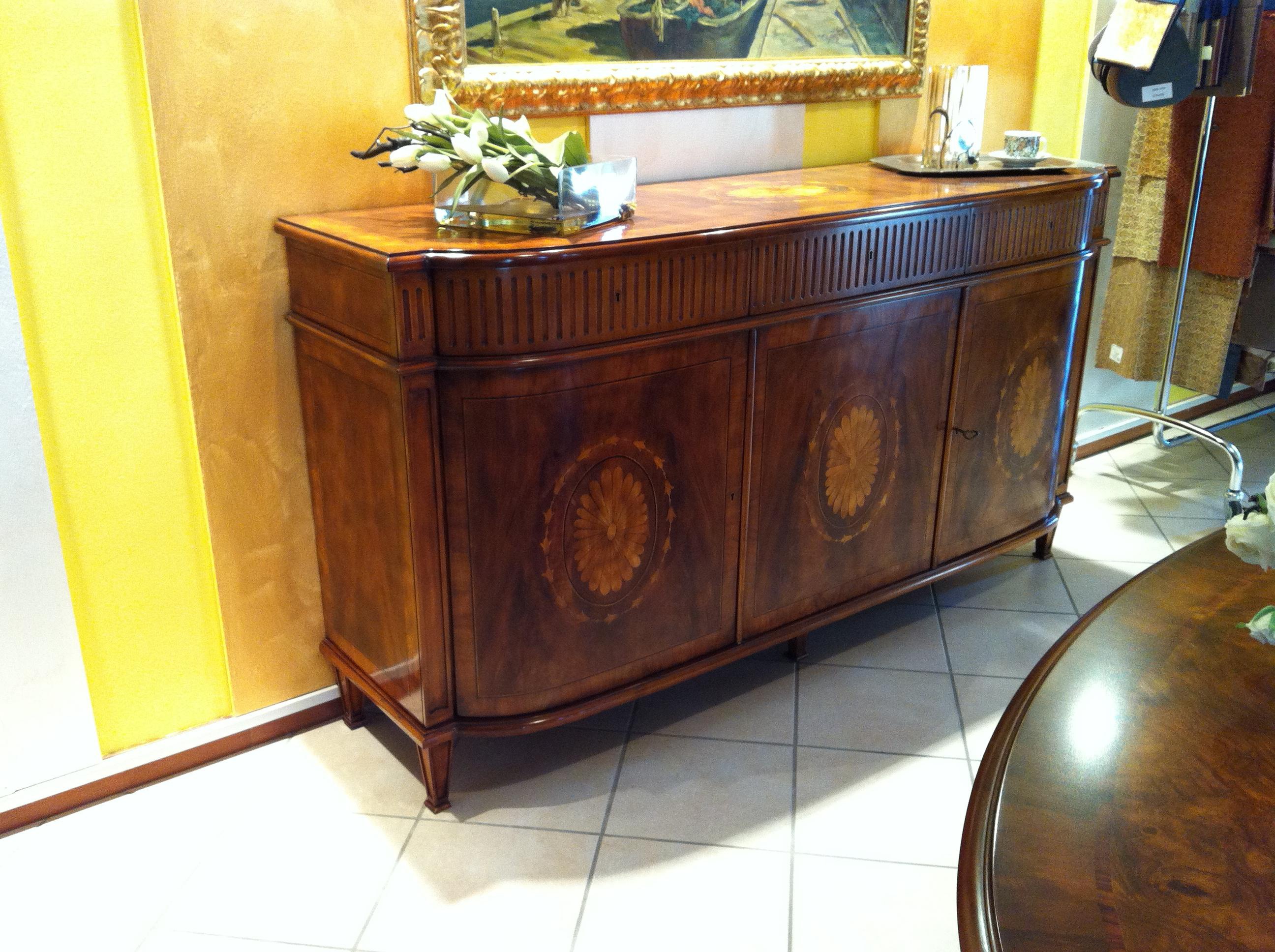 | Description: | Sideboard credenza from Italian manufacturer Palmobili. Low sideboard classic silhouette will adorn the living room, furnished in a traditional or modern style. Made of wood, finished in Golden-brown tones and lacquered. Carved figured top and three hinged doors with marquetry decoration. Three pull-out drawer for silverware and table linens decorated with carving imitating corrugated paper; boxes can be locked. Details of finishes and colors in photo 2. |
