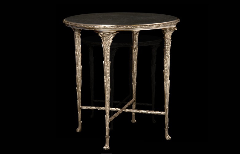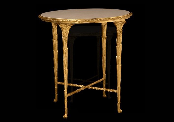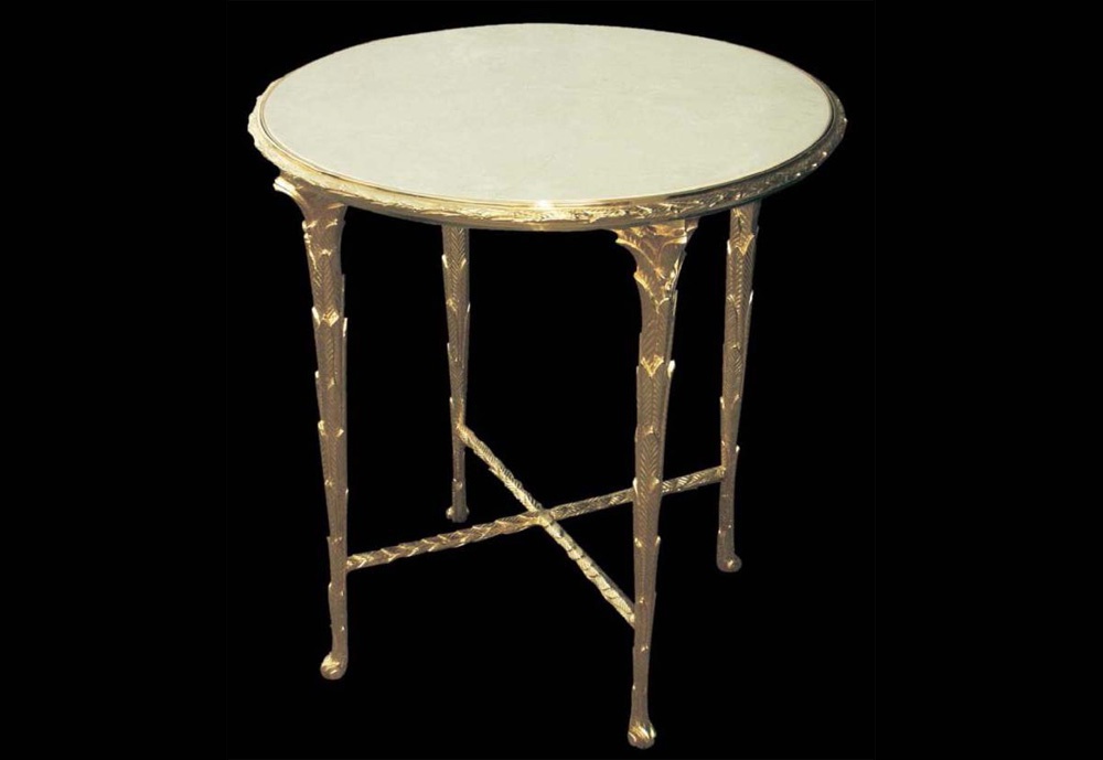 | Description: | Coffee table from French manufacturer Bronze d'art Francais. Model with round marble top. Top supported by 4 legs connected X-shaped pronaoi. |