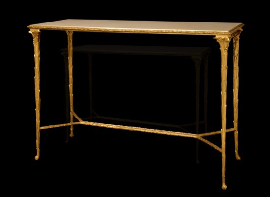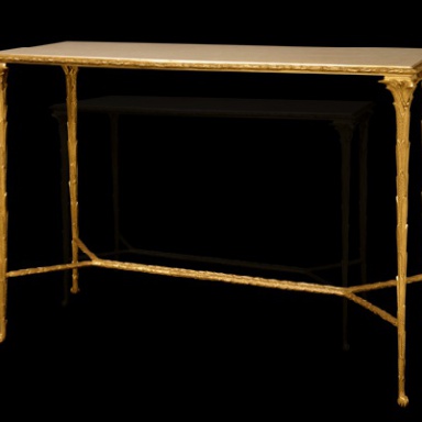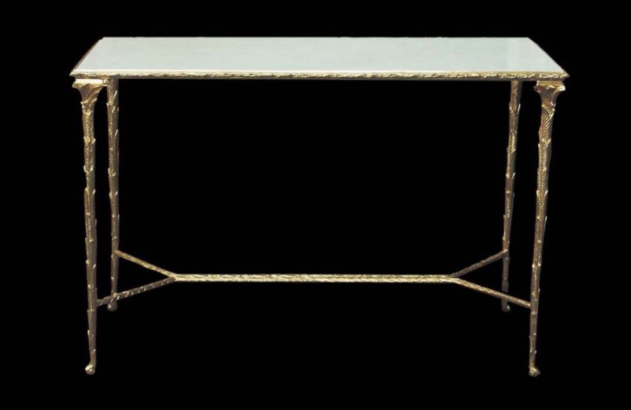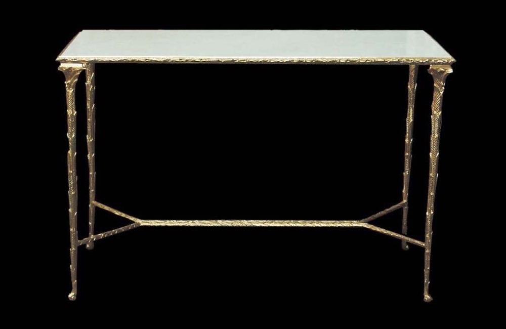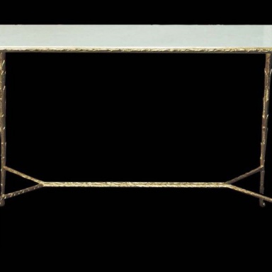 | Description: | Console from French manufacturer Bronze d'art Francais. The model with rectangular marble top. Top supported on 4 tall legs United X-shaped pronaoi. |