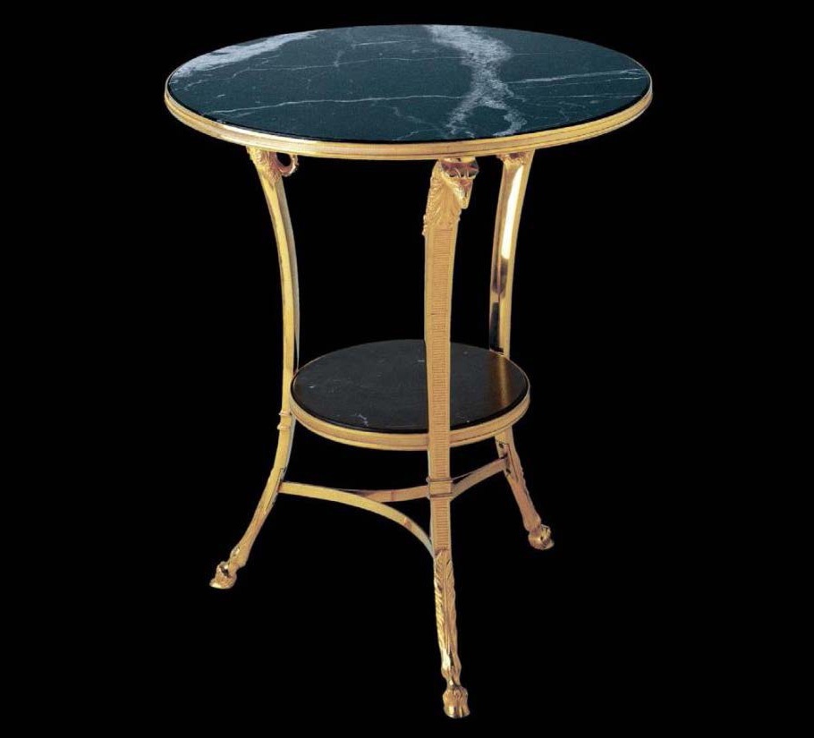 Coffee table from French manufacturer Bronze d'art Francais. The model on three legs with a round top and shelf. The counter is made of marble. Carved legs, each leg decorated with the eagle's head. Finish the catalog of the manufacturer.