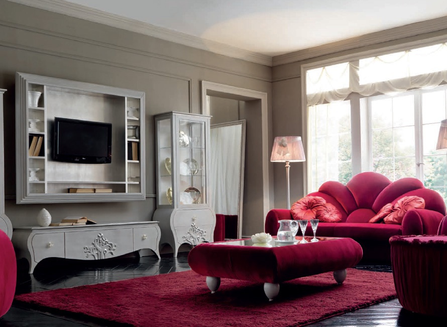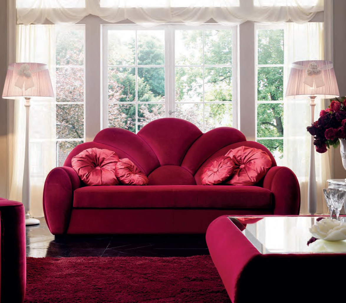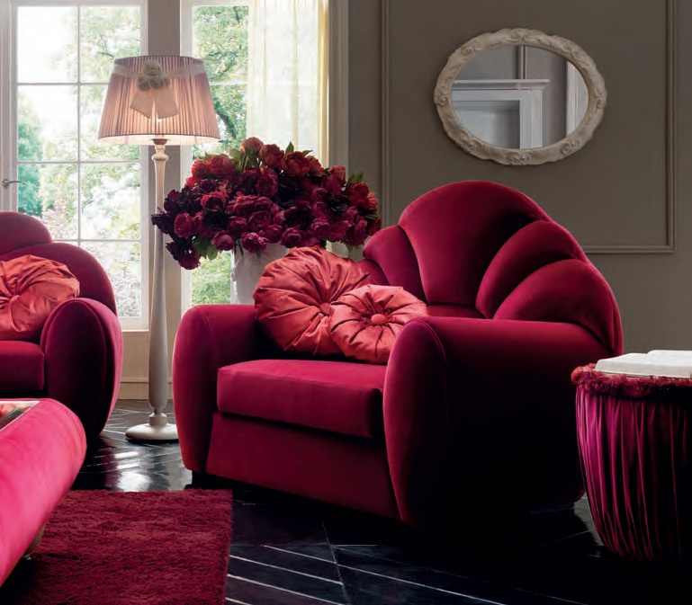 Living room (sofa set) Capri from the Italian manufacturer Meteora. Set consists of sofa, armchairs and coffee table. Armchair and sofa with high semi-circular back. The frame is made of wood. The upholstery is made of textile cloth. Filler - polyurethane foam. Coffee table with a frame made of wood upholstered with textile fabric. Top in rectangular shape is made of glass. Finish colors and upholstery as in the photo.