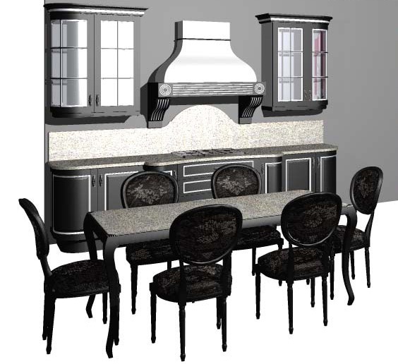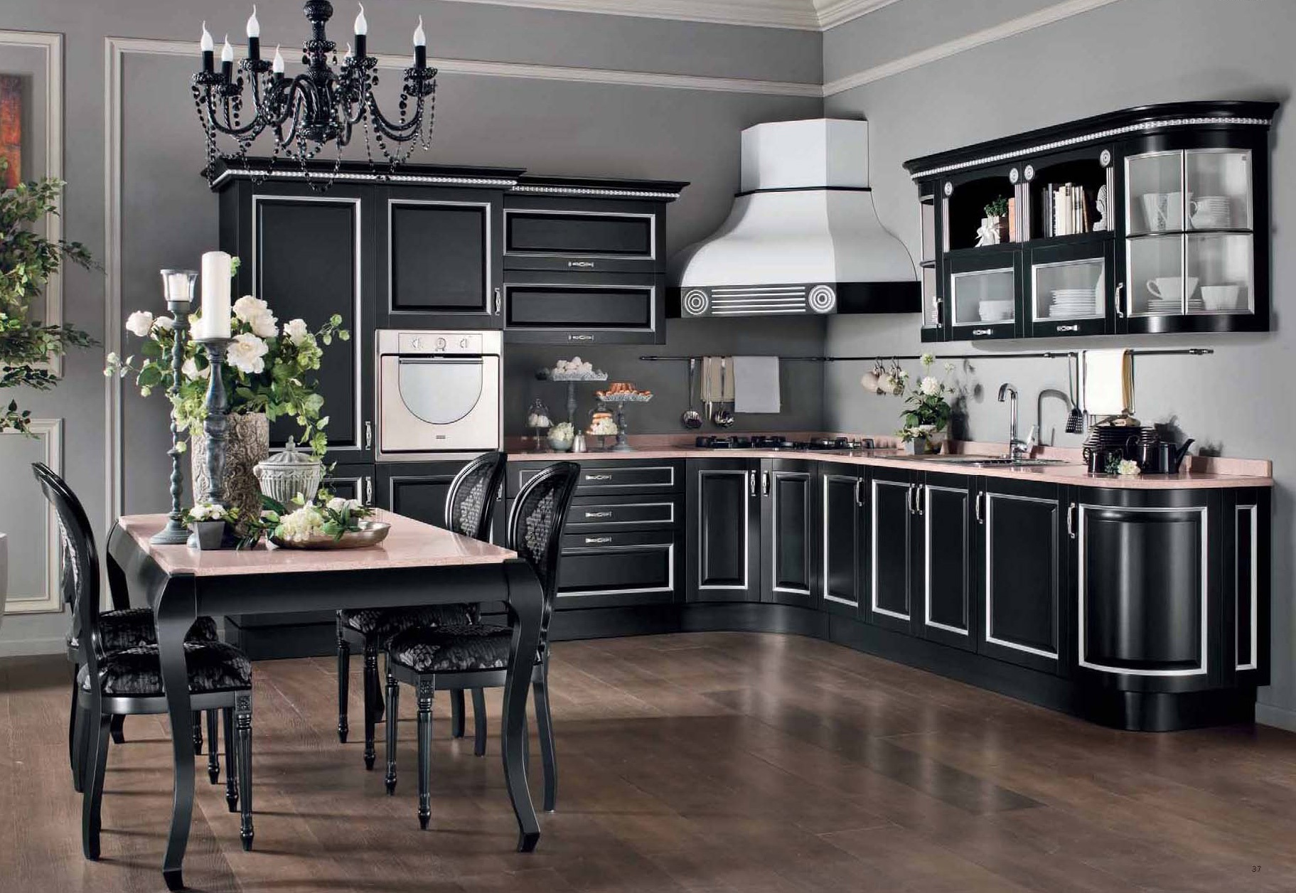 Kitchen (kitchen set) Papillon from the Italian manufacturer Fiamberti. Package included as in the photo. Set includes table and four chairs. Size of table 1800 mm x 900 mm. the Furniture is made of wood. The finish is black lacquer and silver.