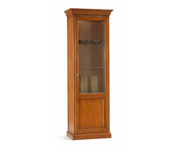 1 fixed, 1 removable wooden shelf. Door with glass. Frame in solid Linden, veneered cherry. Interior lights. A choice of two different fittings: decorative fittings, glossy and decorative fittings, antiqued.