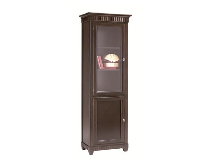 Showcase from Italian manufacturer Selva. The model is made of solid basswood, cherry finish sponem. Lower part: one door (on the inside: removable wooden shelf). Top: one glass door (inside are two adjustable wood shelves). Hinged doors open on the right side. Panel doors available from smooth wood (LI), corrugated wood (RI), braided (LO) or in leather embossed crocodile (PE). Finish options: cherry / distressed cherry / cherry / distressed dark walnut / Sepia / gray (pigeon wing). Possible waxed and polished or only polished options.