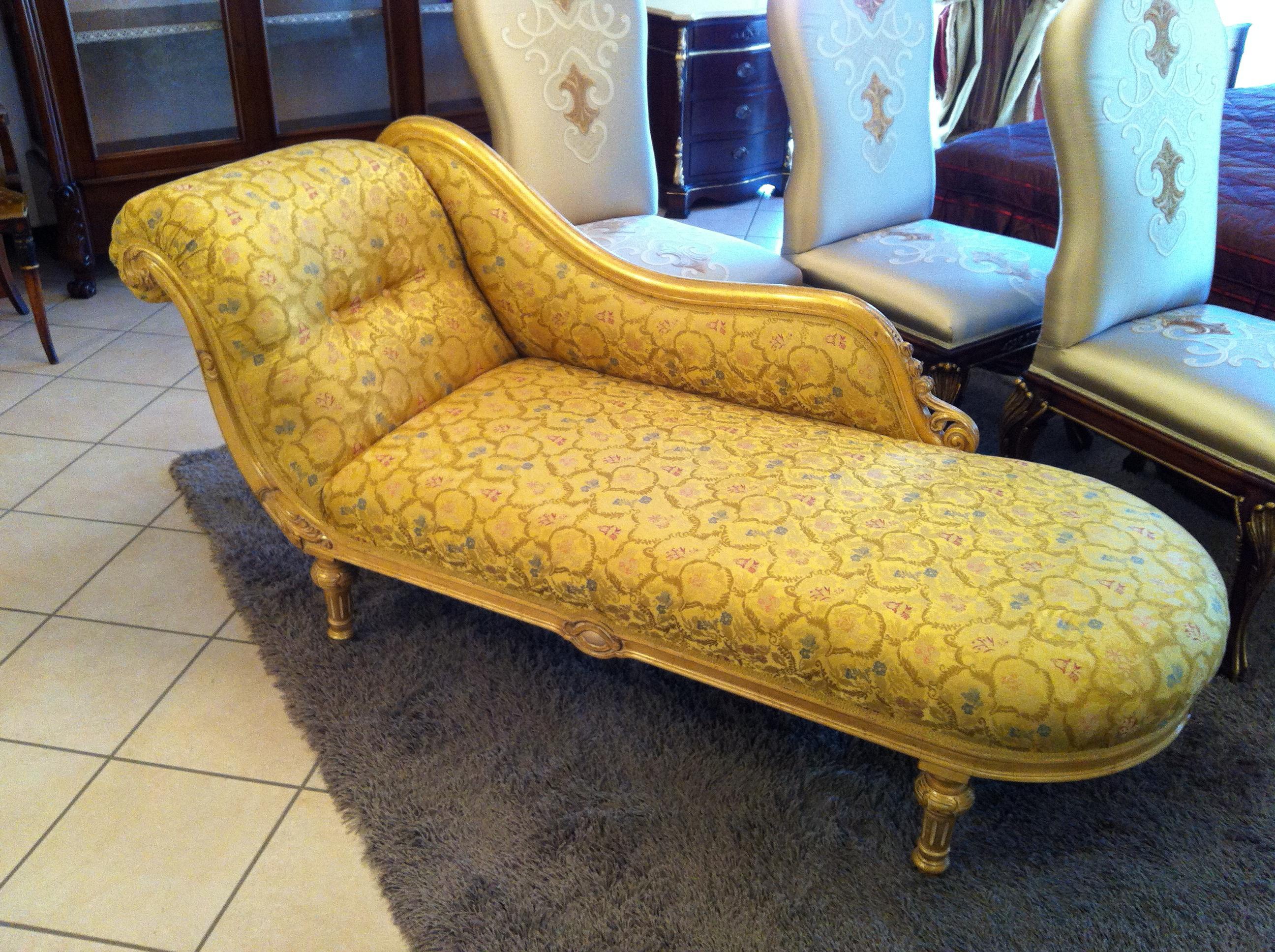 The couch from the Italian manufacturer Palmobili. Graceful daybed, designed in the Rococo style, is a favorite place for relaxing during the day and the decoration of the living room. The right-hand couch; the frame and legs, made of wood, decorated with carvings. The backrest headrest and rolled in a wooden framed, fabric - textile with flower pattern. The overall color scheme is shades of yellow. The headboard is decorated with two recessed buttons. The shades and details of the finish in the photo.