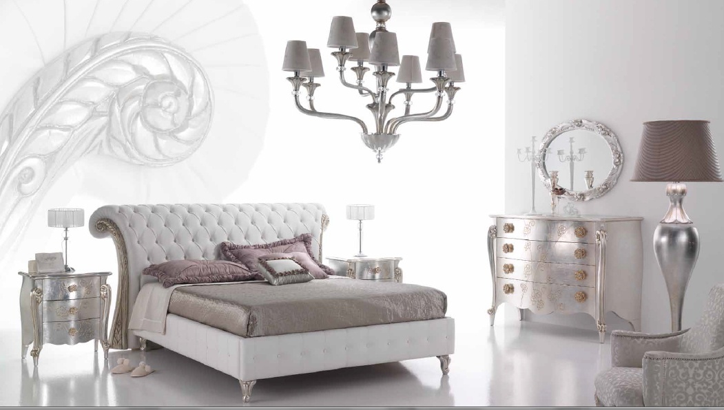 Set for bedroom Etoile from the Italian manufacturer Piermaria. Double bed with high headboard, embellished with stitch Capito and carvings in silver finish. The frame is made of wood, upholstery - textiles or leather from the company portfolio. A chest of drawers and bedside table in natural wood finish with silver.