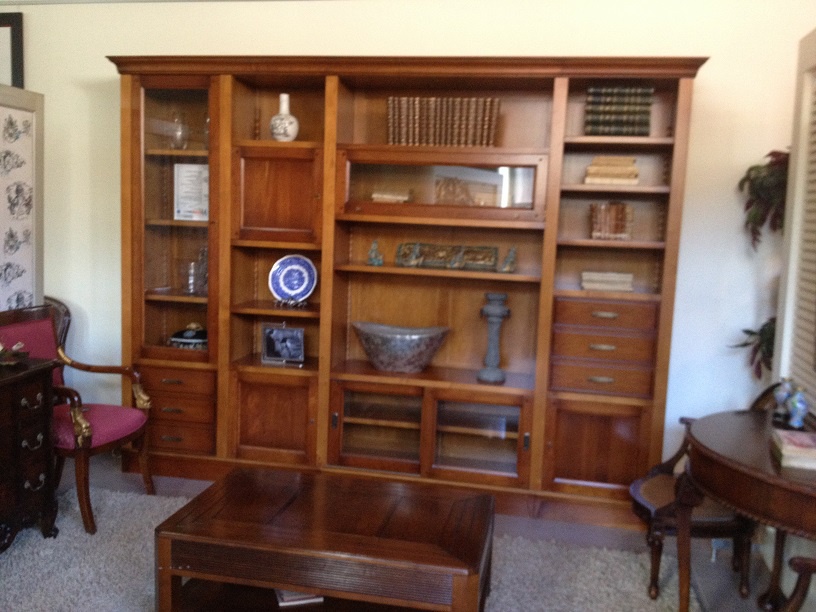 Wall from Portuguese manufacturer of AM Classic. The model is made from solid wood. Provided hinged wood and glass doors, drawers and open storage units. (As pictured).