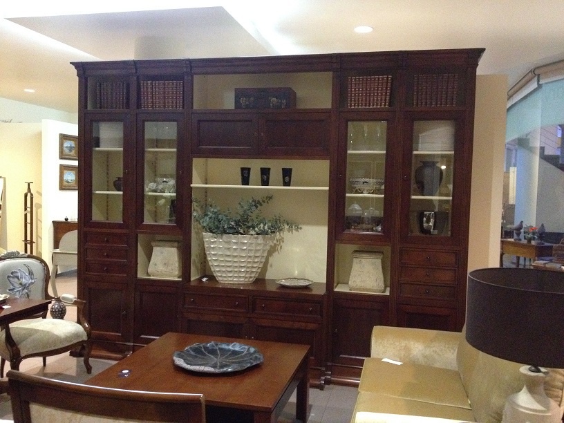 Wall from Portuguese manufacturer of AM Classic. The model is made from solid wood. Consists of five separate sections. Provides sliding glass and wood doors, drawers and open storage units. (As pictured).