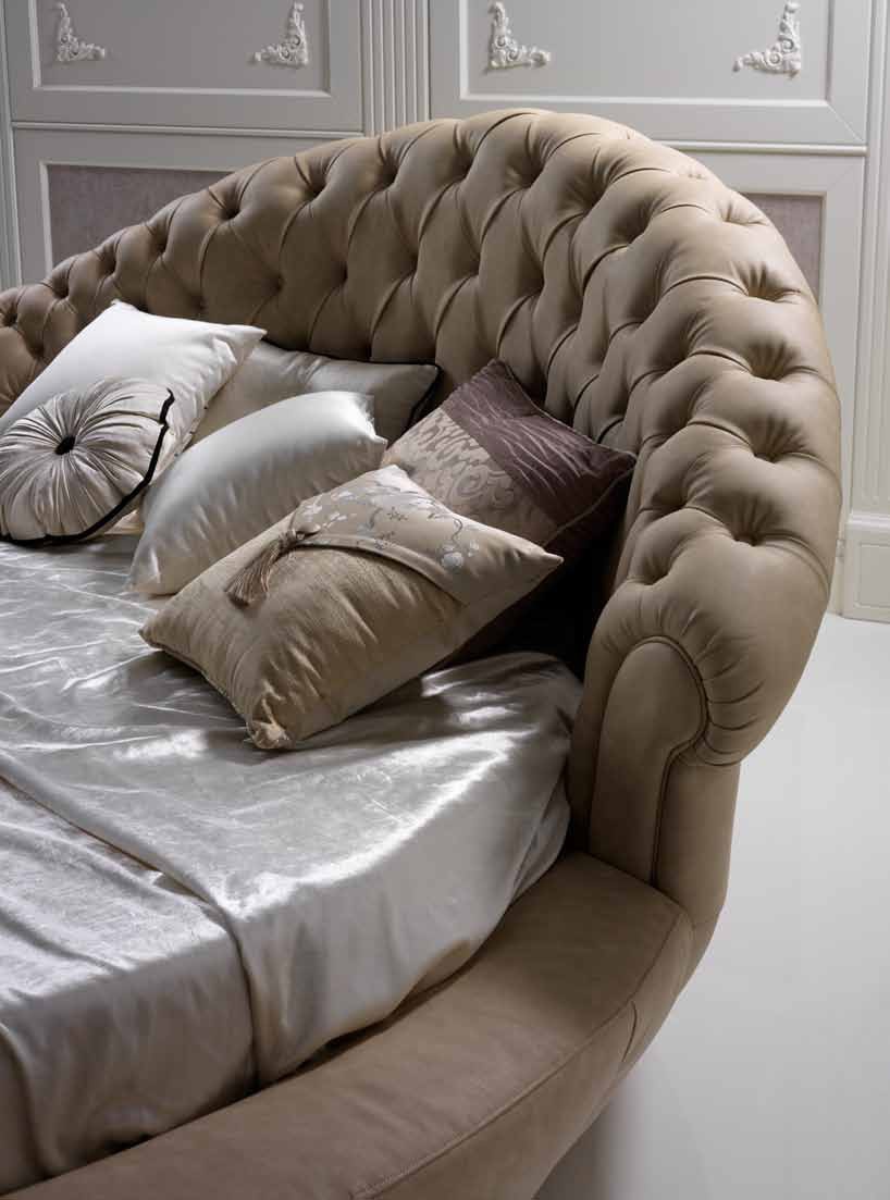 Round double bed Estro Kapitone from the Italian manufacturer Piermaria. The frame is made of natural wood, upholstery - textiles from the company portfolio. Filler - polyurethane foam. The model combines comfort and functionality. Finishes in stock.