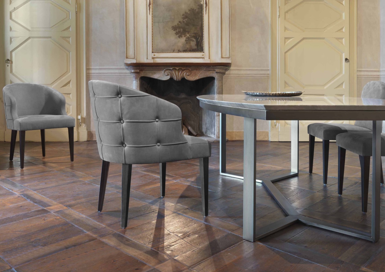 | Description: | The chair is upholstered in Charlotte from the Italian manufacturer Giulio Marelli. To produce frame, use solid beech wood and multilayer plywood in combination with crossed elastic straps design is also reinforced with bars made of beech. Filling of the seat and backrest polyurethane foam, wrapped in Dacron. Upholstery leather cat. Lusso art. Nabuk 3M col. grey. |