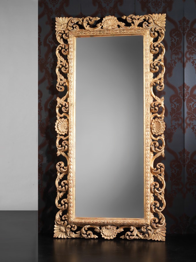 Rectangular mirror from the Italian manufacturer Spini. Wide carved frame mirror wooden frame, made by hand, is a complex garland of recurring accantas. The model can be used as wall or floor standing mirror in a bedroom or other interior designs. Trim - catalog of the manufacturer.