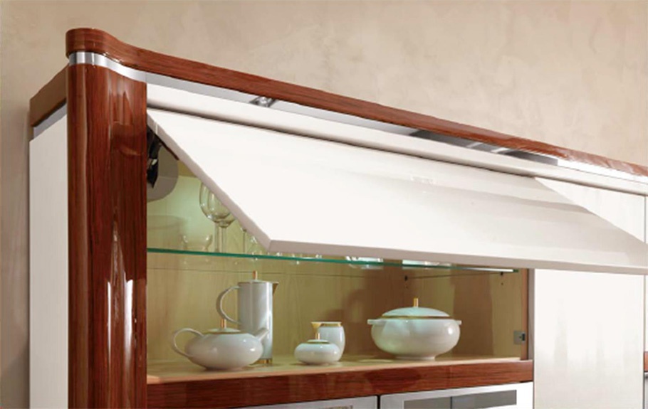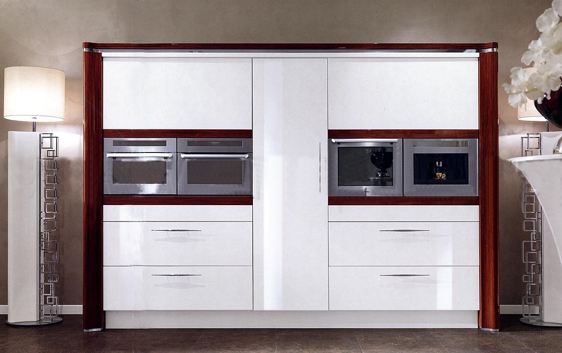 Kitchen (kitchen set) from Montenapoleone Italian manufacturer Redeco. Set consists of a cupboard with columns for built-in appliances and kitchen island with Breakfast bar, complemented by accessories. Finishing varnish, No. 19 pearl white and # 16 Rosewood glossy inside finish with natural wood, details in chrome. Kitchen Montenapoleone will bring true joy and aesthetic pleasure, and most importantly – meet the needs of every housewife.