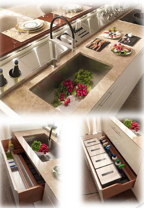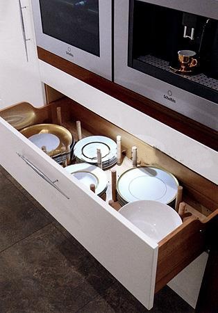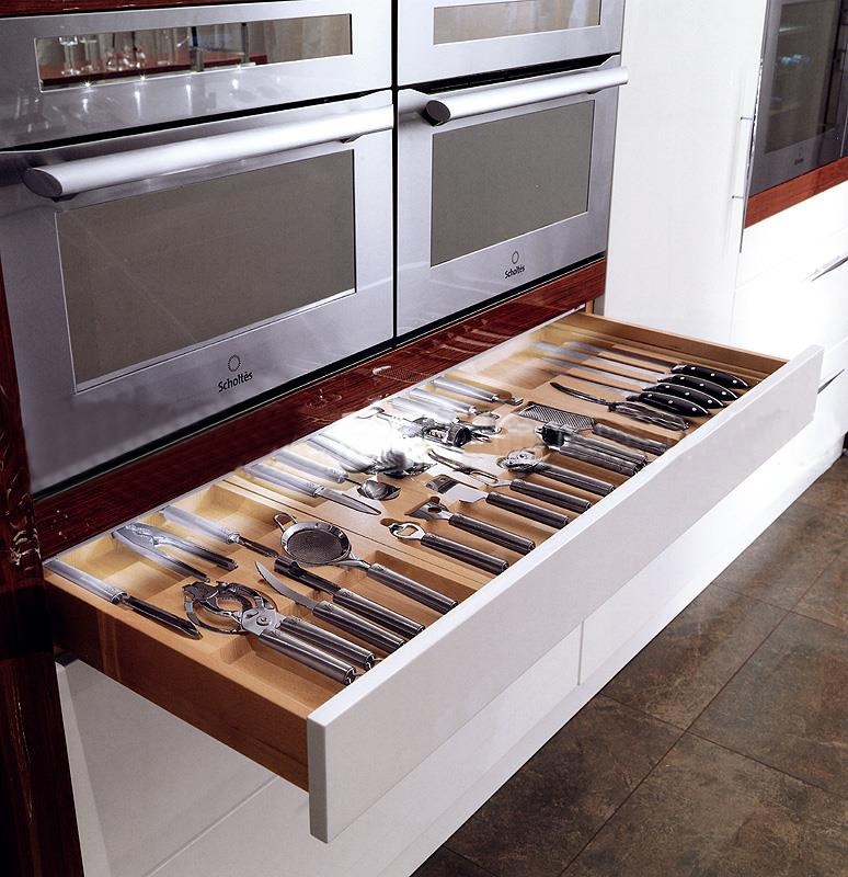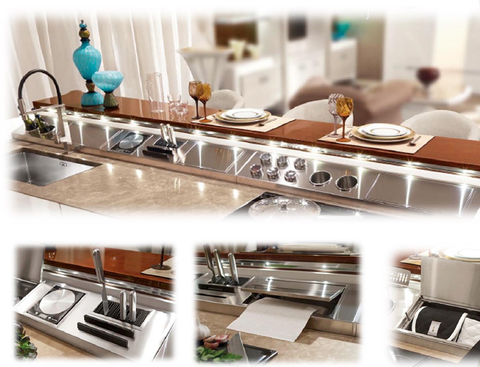 1) Kitchen with columns for built-in appliances L. 330 P. 66 H. 230 cm. Accessories: Cutlery, multi-touch LED lighting in drawers, the stand for utensils.