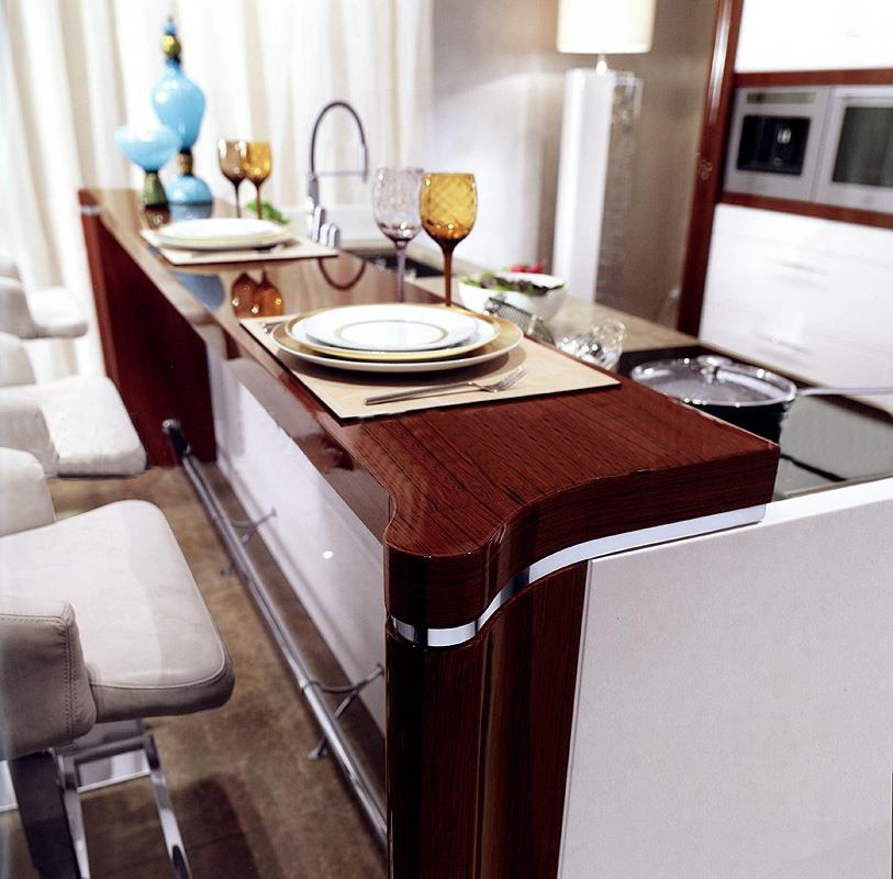 2) Kitchen island with Breakfast bar 325 P. L. 130/90 1300/900 H. 111. Countertop - marble. Accessories: waste container in the drawer, touch LED lighting in the drawer, the drawer for Castrol, footrest in steel, chrome fixtures LED.