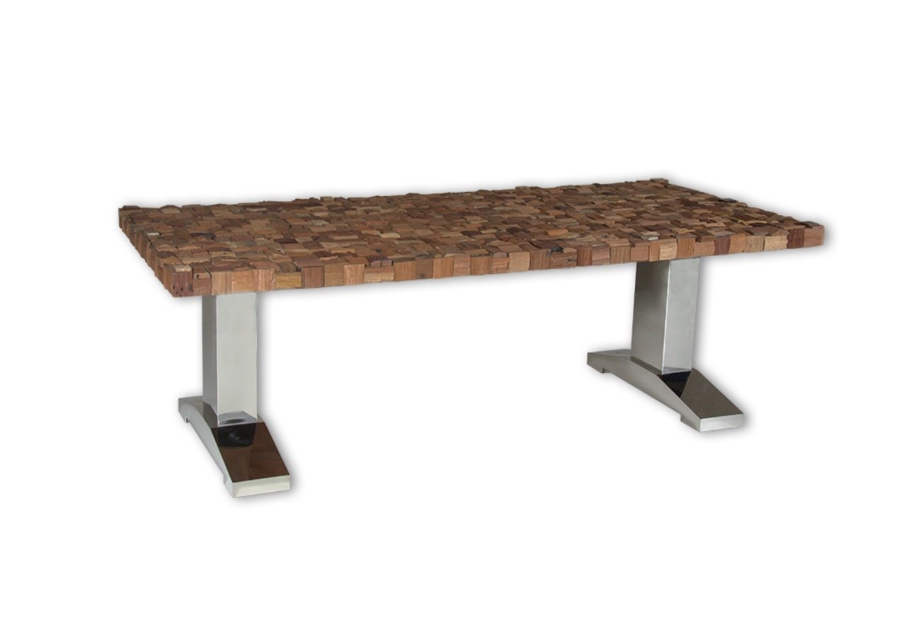 Irresistible dining table from Spanish manufacturer Contradictions. Countertop rectangular, wooden bars, covered with clear glass. Massive pillars, made of stainless steel. Trendy combination of high-tech and eco-friendly style make this product an essential attribute of stylish, modern interior.