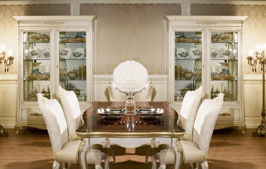 | Description: | Sideboard from Italian manufacturer Palmobili. Luxury sideboard in the Louis XV style is made of wood and finished in white lacquer. The upper part is a showcase with two glazed hinged doors, three glass adjustable shelves and one fixed; the back wall is mirrored. The lower part is a snack bar with a curved profile and two sliding doors. The sideboard is decorated with carving, gilding and decorations, all decorations made by hand. Details, and shades on photo 1. |