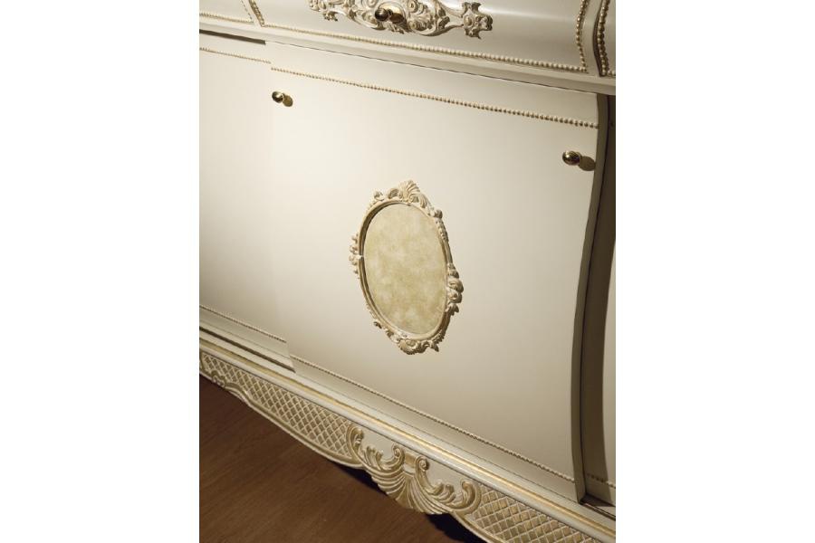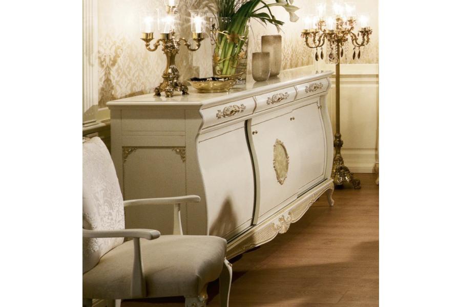 Sideboard credenza from Italian manufacturer Palmobili. Luxury buffet classic silhouette, made in the Louis XV style, will decorate the living room or dining room, furnished in a traditional style. Material - wood, finish - white lacquer. Convex profile, at the bottom of three sliding doors, the middle decorated with carved medallion. Under the table top are three pull-out drawer for silverware and table linens. A snack bar is decorated with carving and gilding, finishing and decoration - hand made. Finish options can be selected in the catalog of the manufacturer.