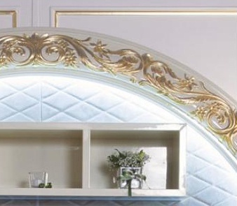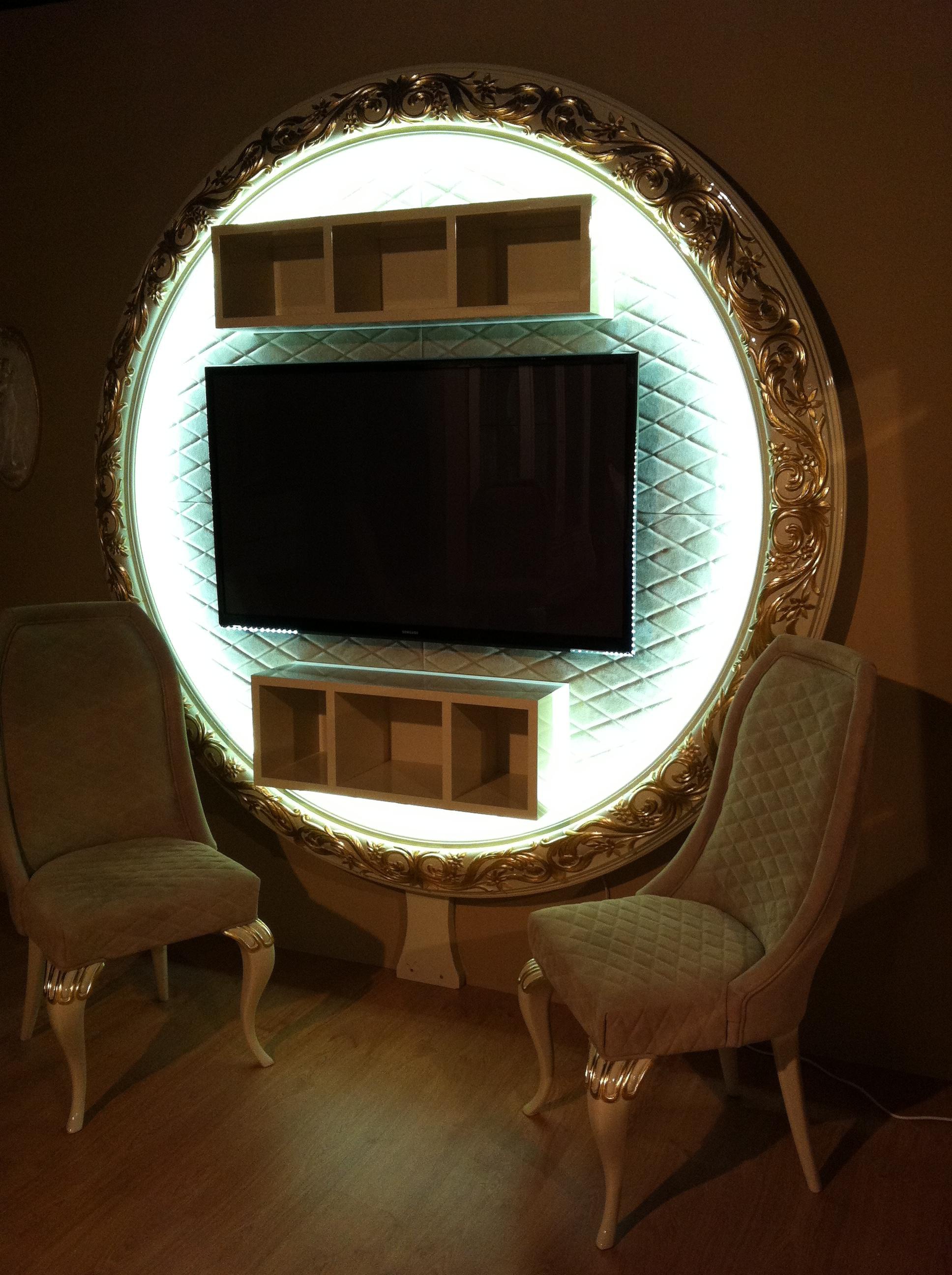 | Description: | Wall panel for TV from the Hollywood collection from the Italian manufacturer Palmobili. Luxury round panel made of polyester in an art Deco style, enter the TV in the living room or bedroom and decorates the wall. The outer carved frame, decorated with lacquer and gold leaf. Textile panels finished in suede. Complete with two shelves. Panel white, outer frame and shelves made in light brown colors. Details of finishes and colors in photo 3. |