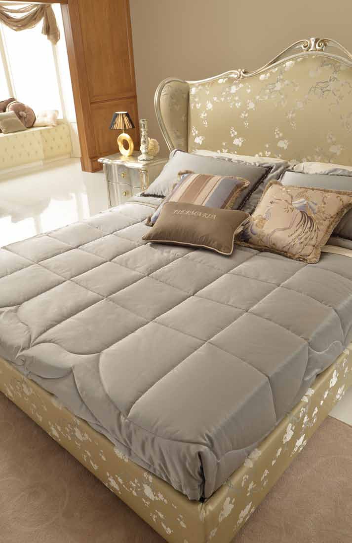 Silver double bed from Italian manufacturer Piermaria. Double bed with high headboard, the frame is made of wood, upholstery - textiles. Colours in stock.