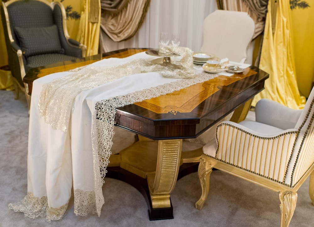 Dining table from the Italian manufacturer Provasi. The table top is made of ebony wood and myrtles. The finishing - varnish. Legs treated a white patina of the gold leaf in the technique of Oro decape. The decor thread. The product in the Baroque style, perfectly complement the classic interior of the living room, dining room.