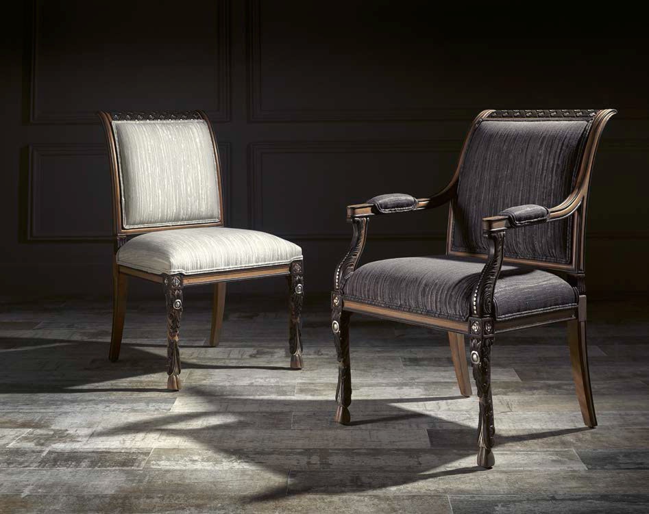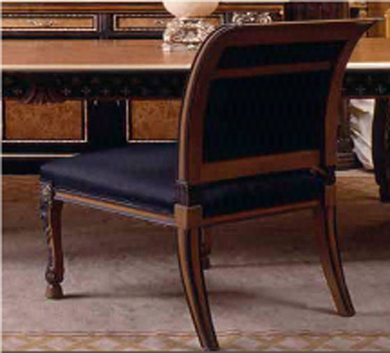 Chair without armrests Juan Carlos from the Spanish manufacturer Coleccion Alexandra. The frame is made of wood. Seat and back upholstered in fabric. The surface is covered with varnish. Decor - hand carved. Will perfectly fit the interior of your dining room.