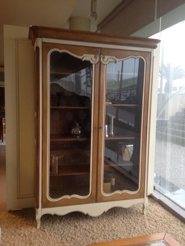Showcase on figured legs from Portuguese producer AM Classic with two hinged glass doors. Made of solid wood with contrasting white lacquer finish and artificial ageing. Carved handmade. Inside there is a wood shelf. (As pictured).