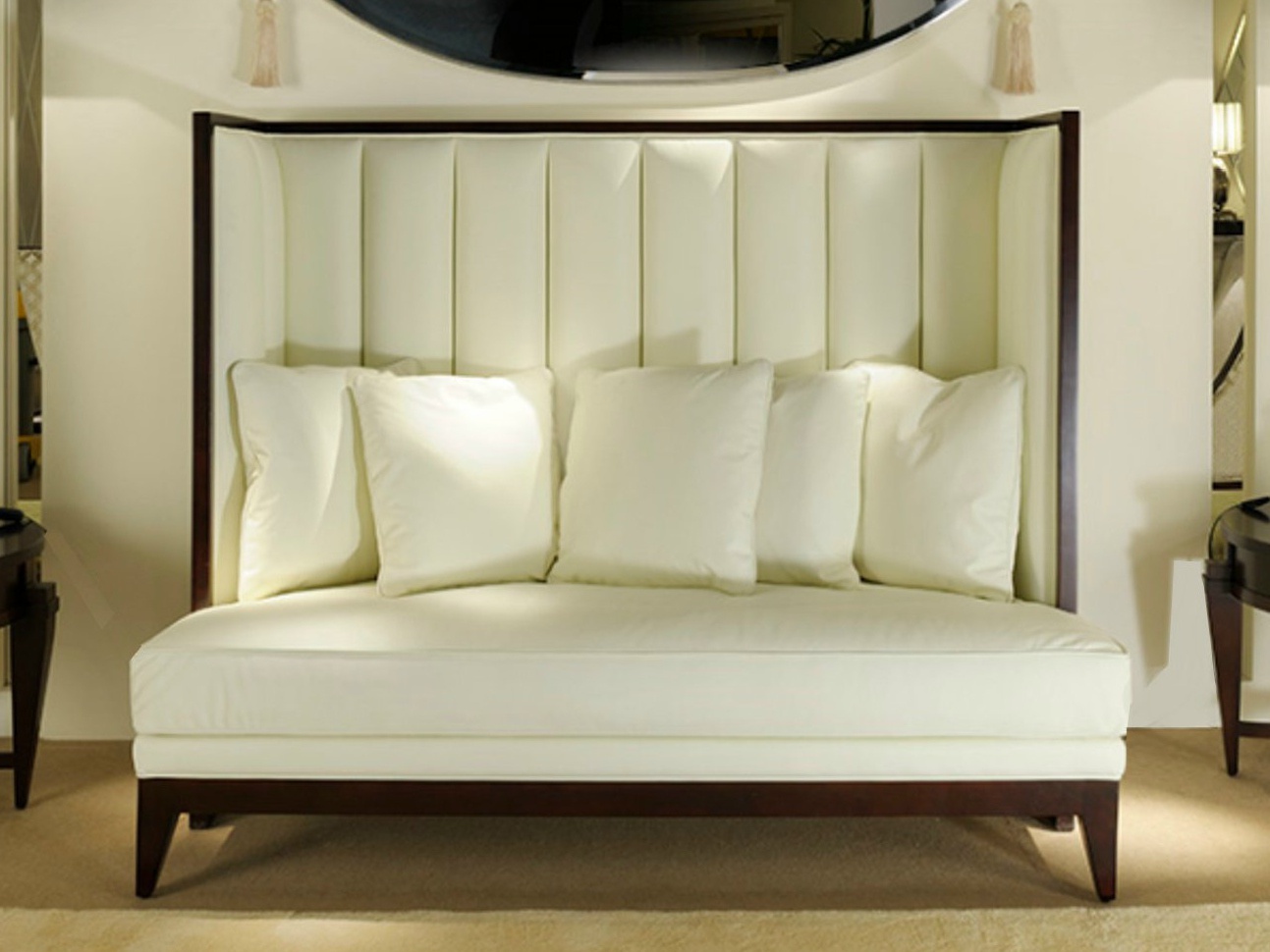 A sofa with a high back from the Italian manufacturer Сasali. The frame is made of natural wood, upholstery - leather. Available trim PALISSANDRO/PELLE COLORE CREMA, veneer rosewood/leather in cream colour. Model in the style of art Deco. Fits perfectly into a large living room in classic style.