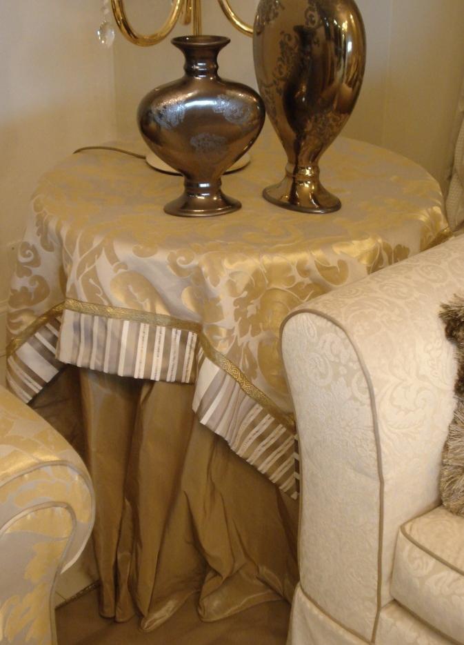Round table Monica from the Aurea collection from the Italian manufacturer Bruno Zampa. Round pridivanny table. The top is decorated with double cloth. Frame made of solid wood.
