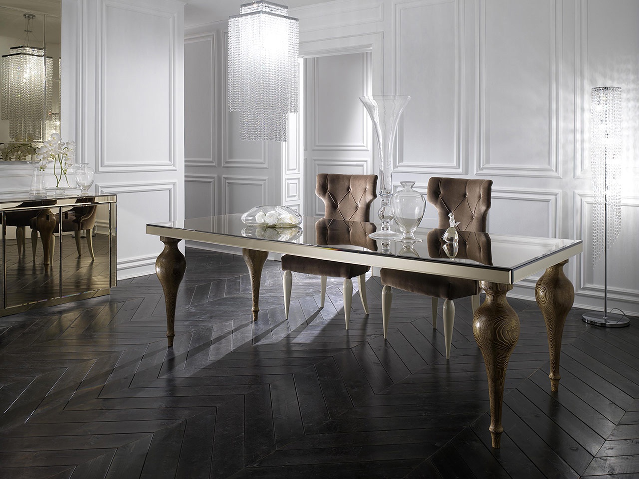 Dining table Envy from the Italian manufacturer DV Home. A rectangular table will look perfectly in any modern interior. Turned legs in the form of balusters made of wood and treated with natural color. The original countertop from laminated glass, trim from the manufacturer top riversito specchio bronzato piede laccato colori in qualsiasi.