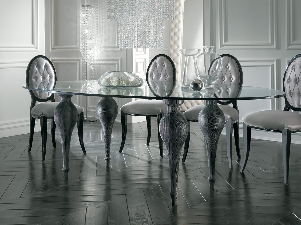 The Egoist dining table from Italian manufacturer DV Home. An oval table will look perfectly in any modern interior. Turned legs in the form of balusters made of wood and treated with varnish, imitates shiny metal. Original table top from transparent glass, finishing the catalog of the manufacturer.